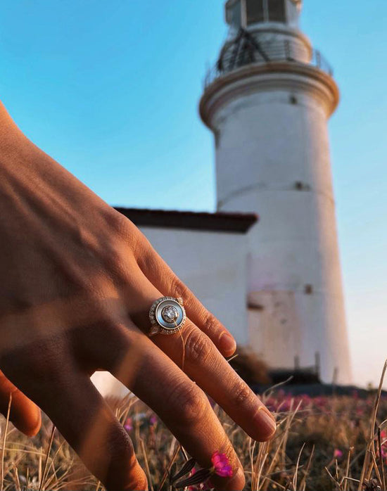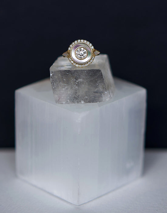 ***This diamond, Mother-of-pearl inlay and engraved 14K ring was designed as an engagement ring for Tara.