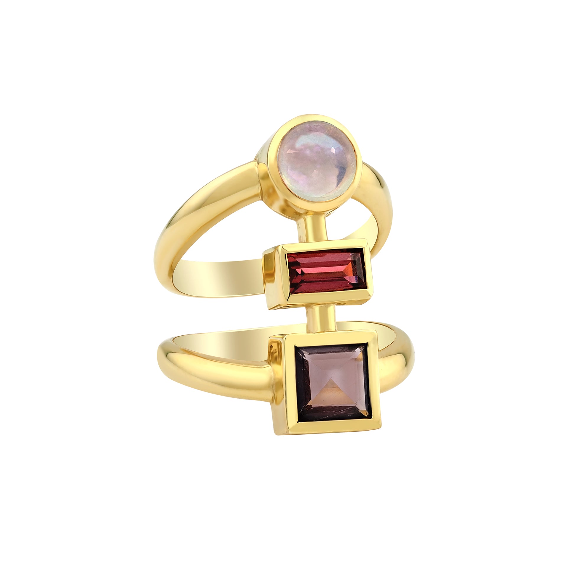 18 ct gold-plated sterling silver ring embellished with Rose Quartz, Rhodolite and Iolite stones.