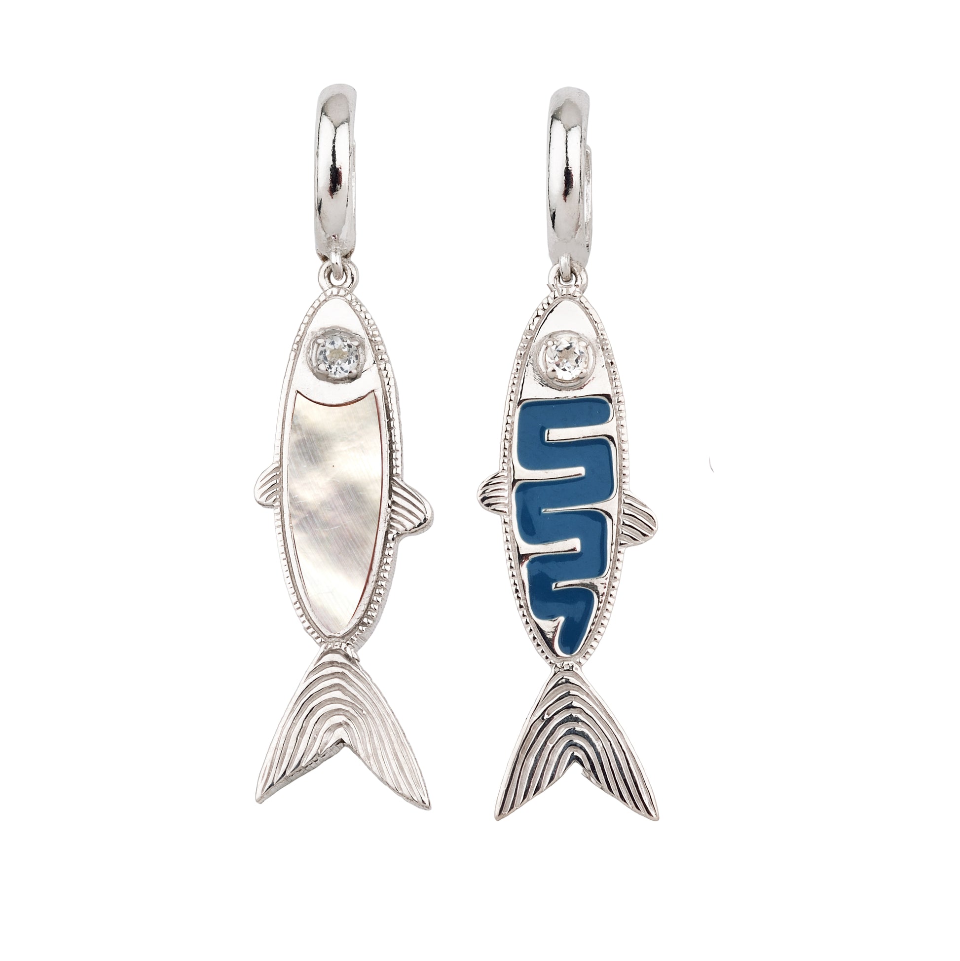 White gold-plated sterling silver earrings featuring teal blue enamel and Australian mother-of-pearl handcrafted inlay.