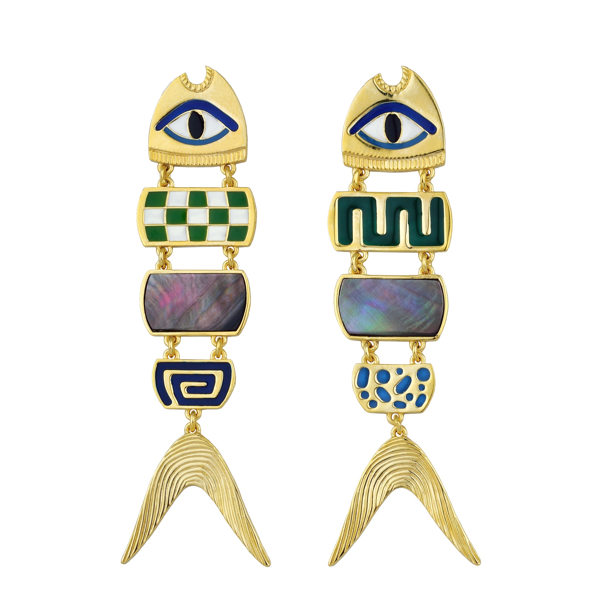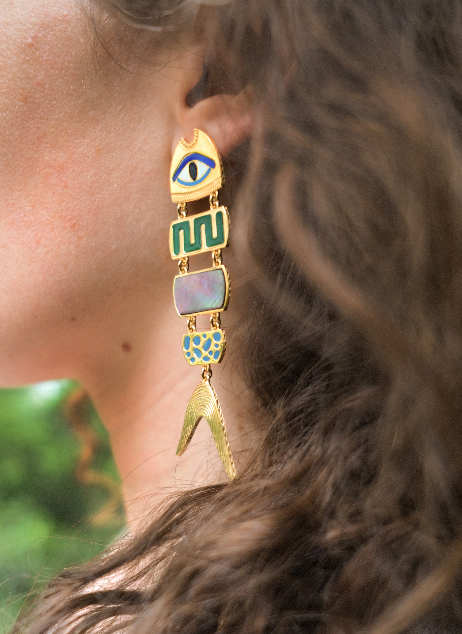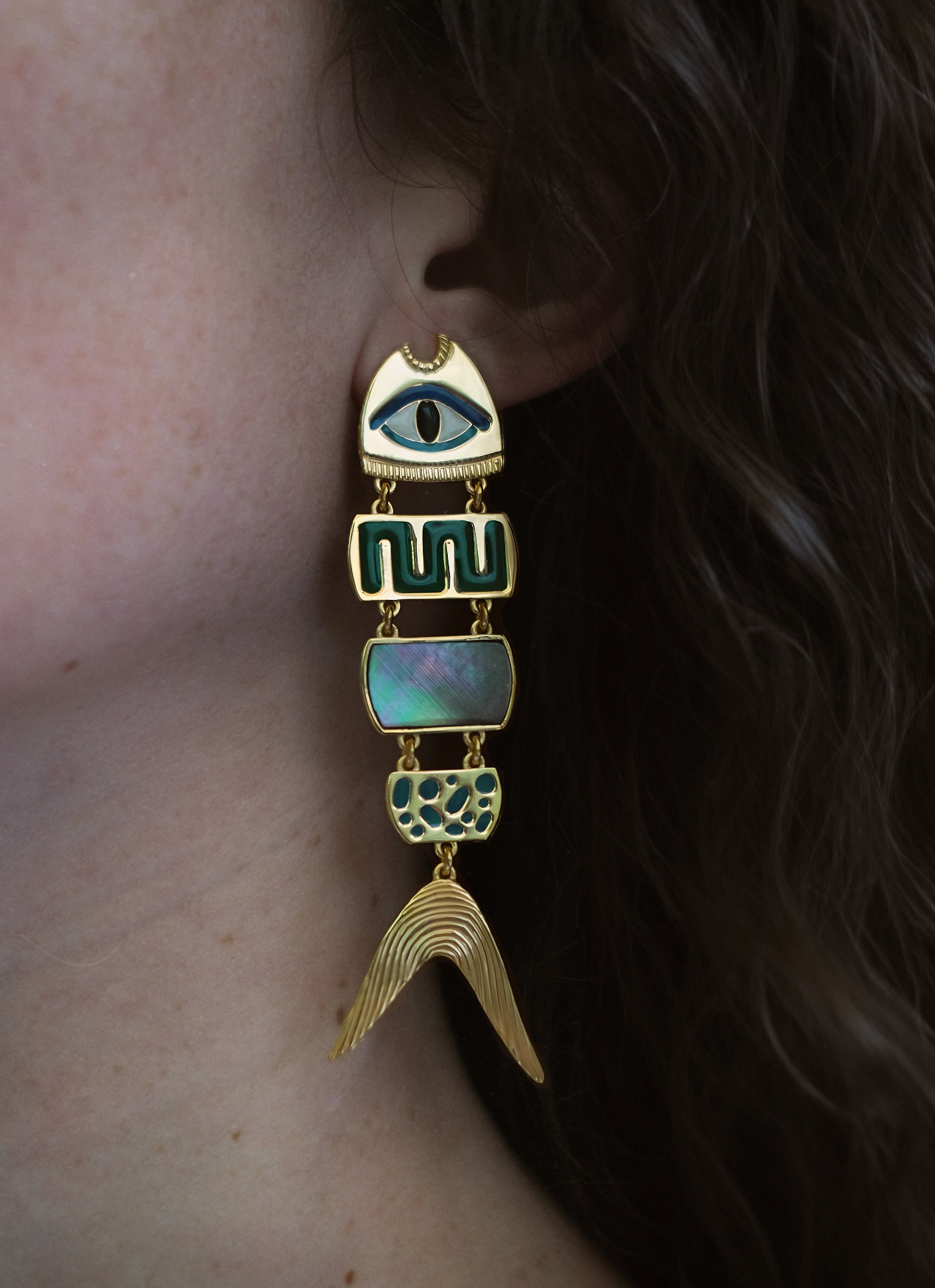 The Big Green Fish earrings sway with your slightest movement, resembling a serene glide through water towards the silent depths. Any simple outfit will do, as these earrings will make a statement on their own.