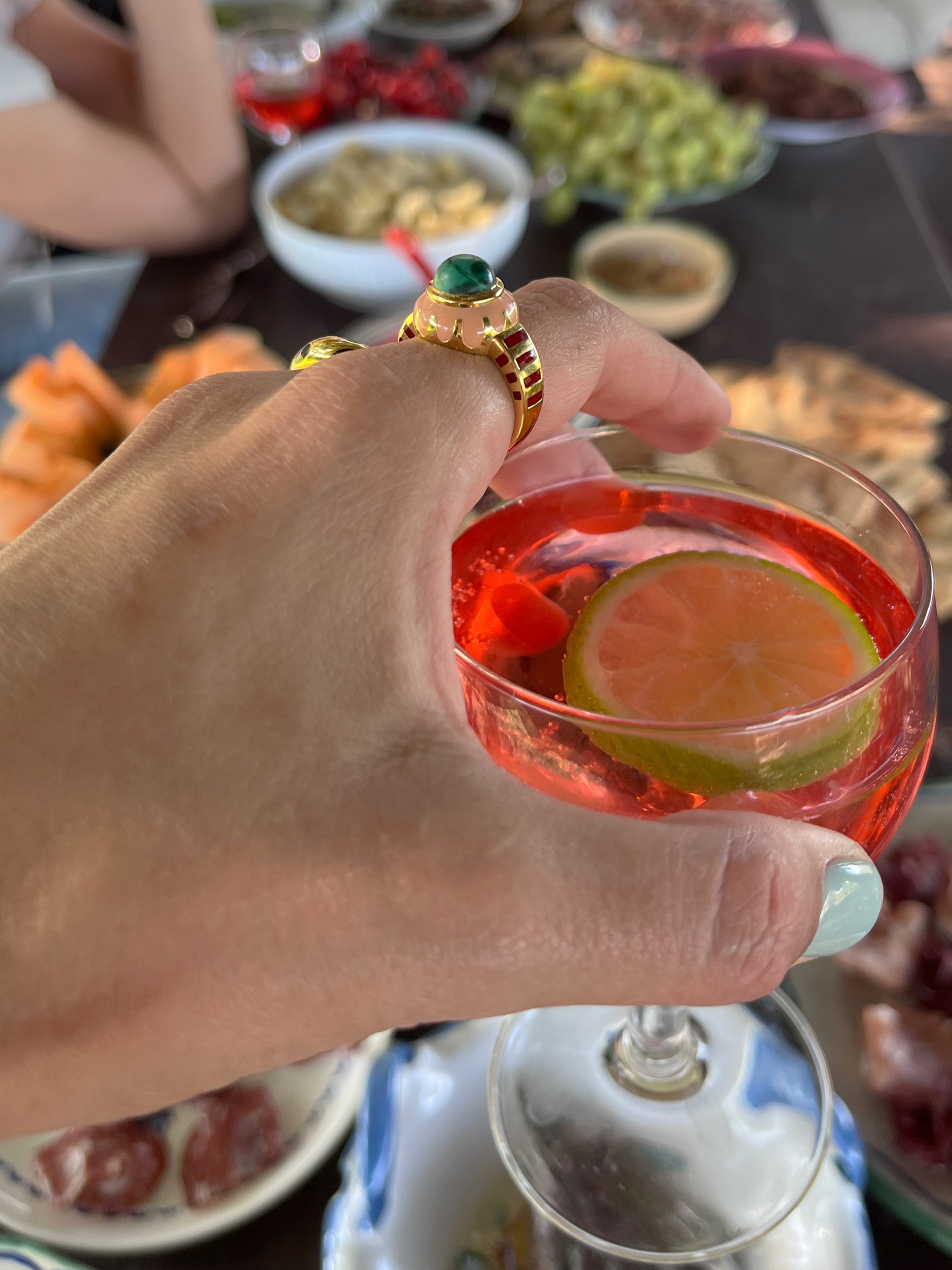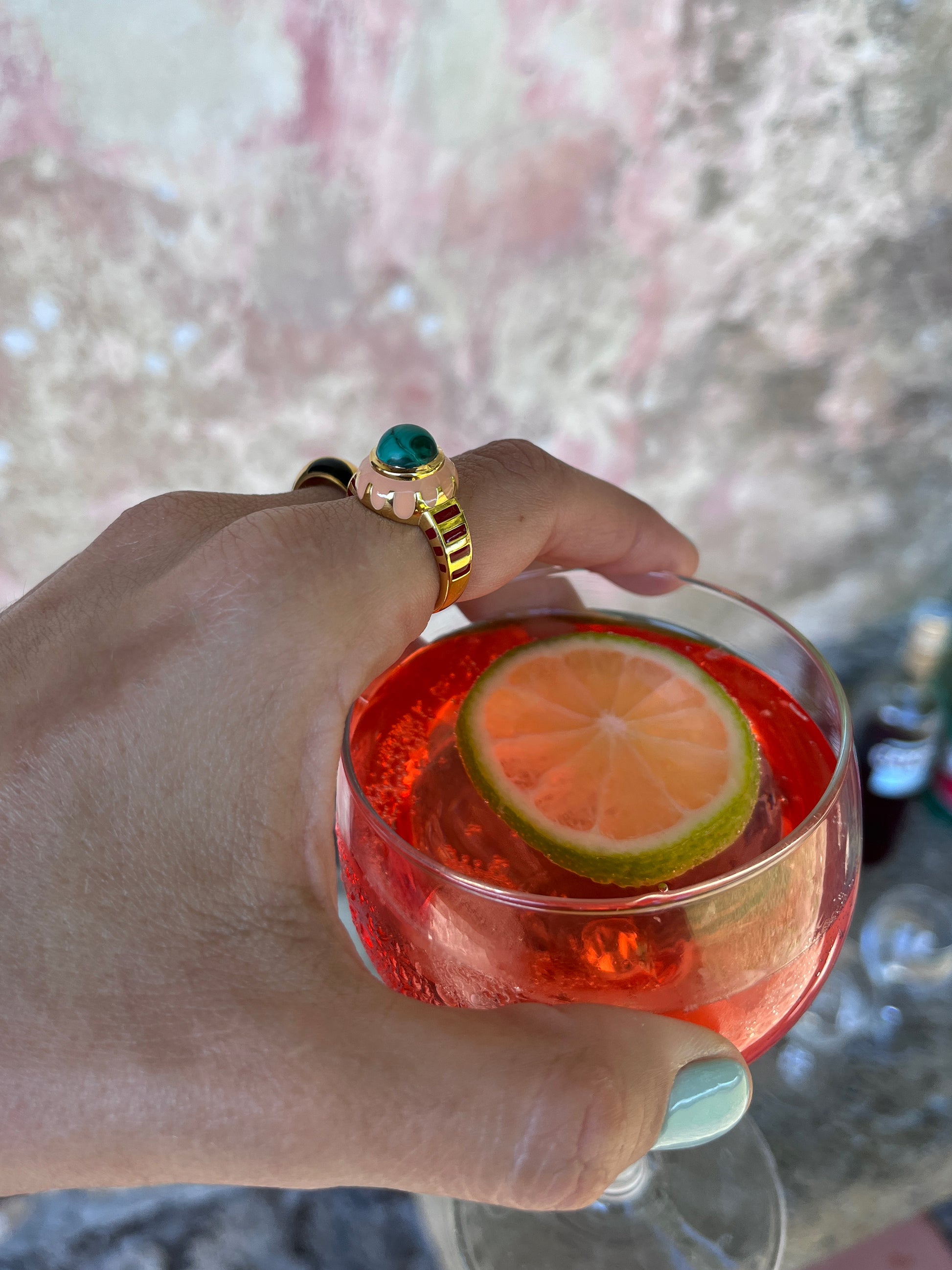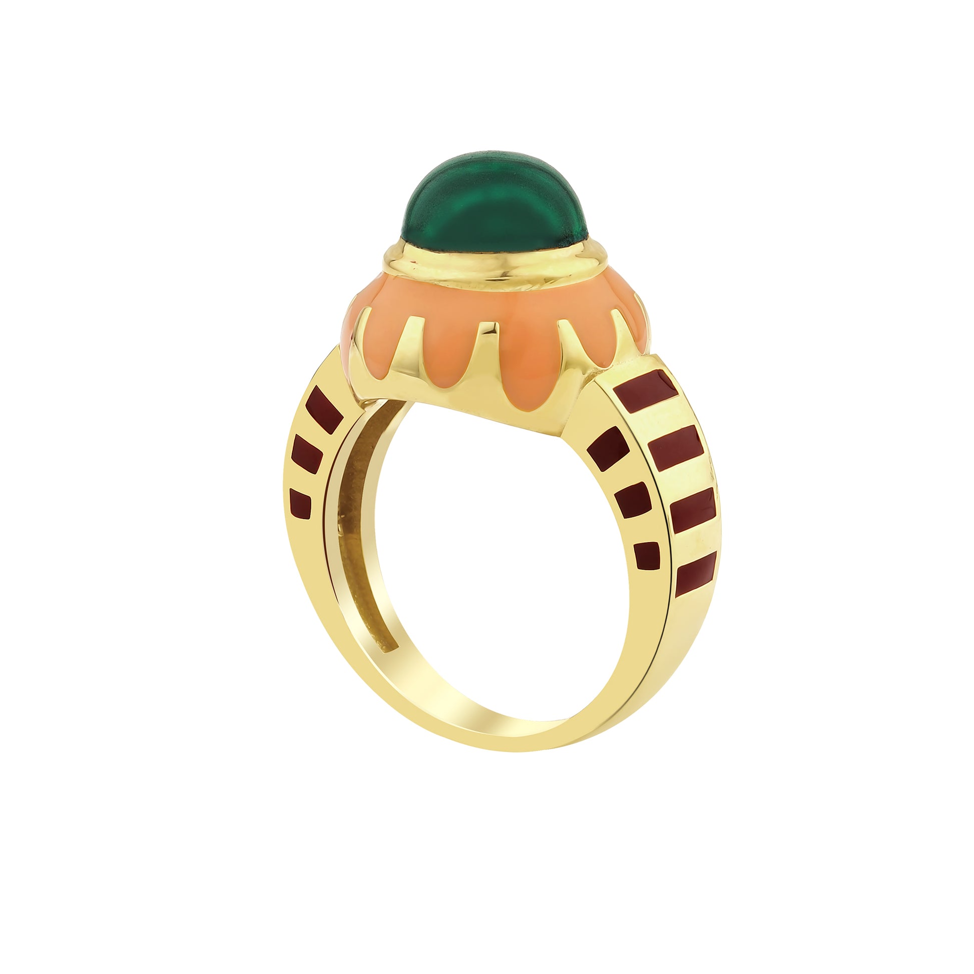 18 ct gold-plated sterling silver ring featuring enamel and embellished with natural Malachite.