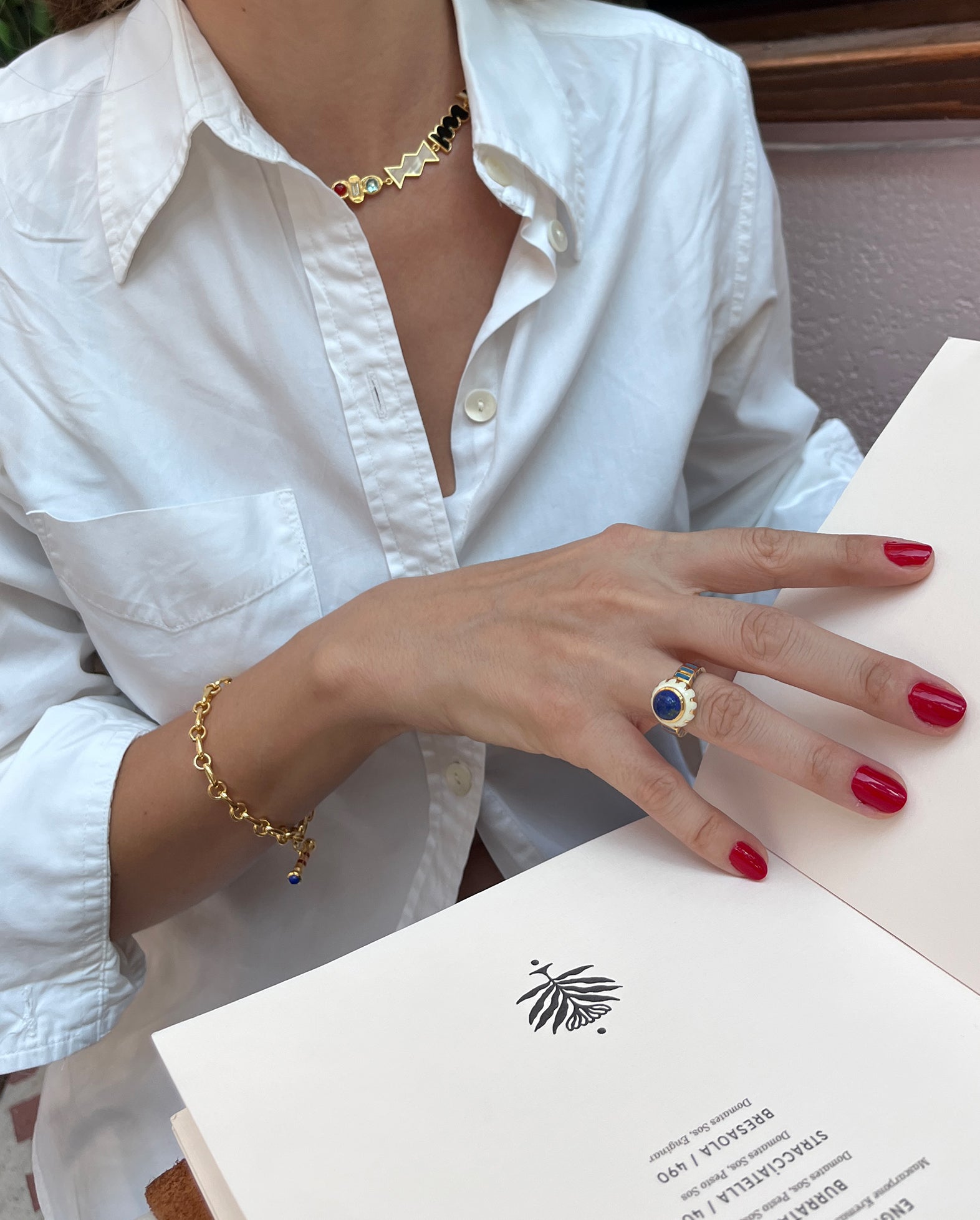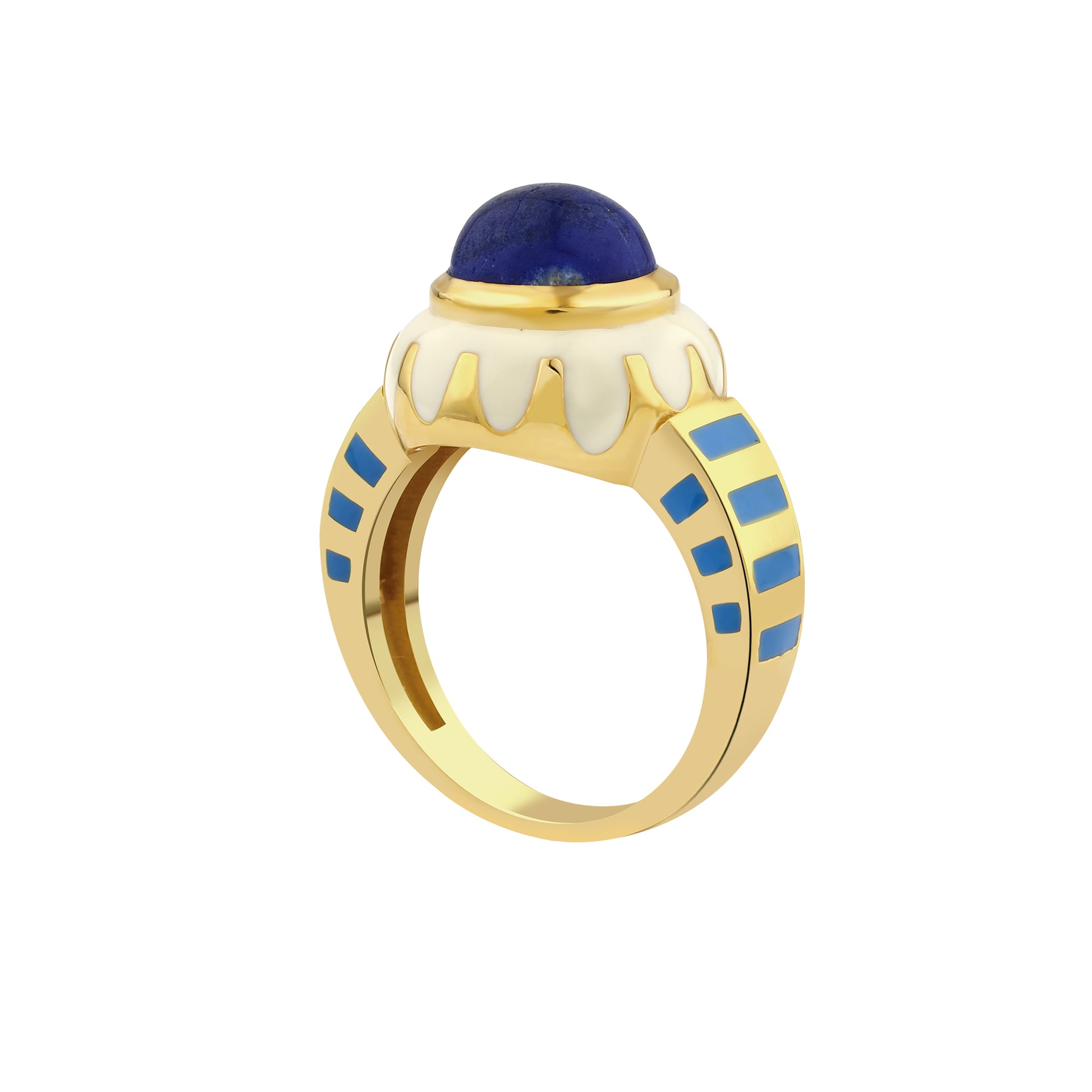 18 ct gold-plated sterling silver ring featuring enamel and embellished with natural Lapis Lazuli stone.