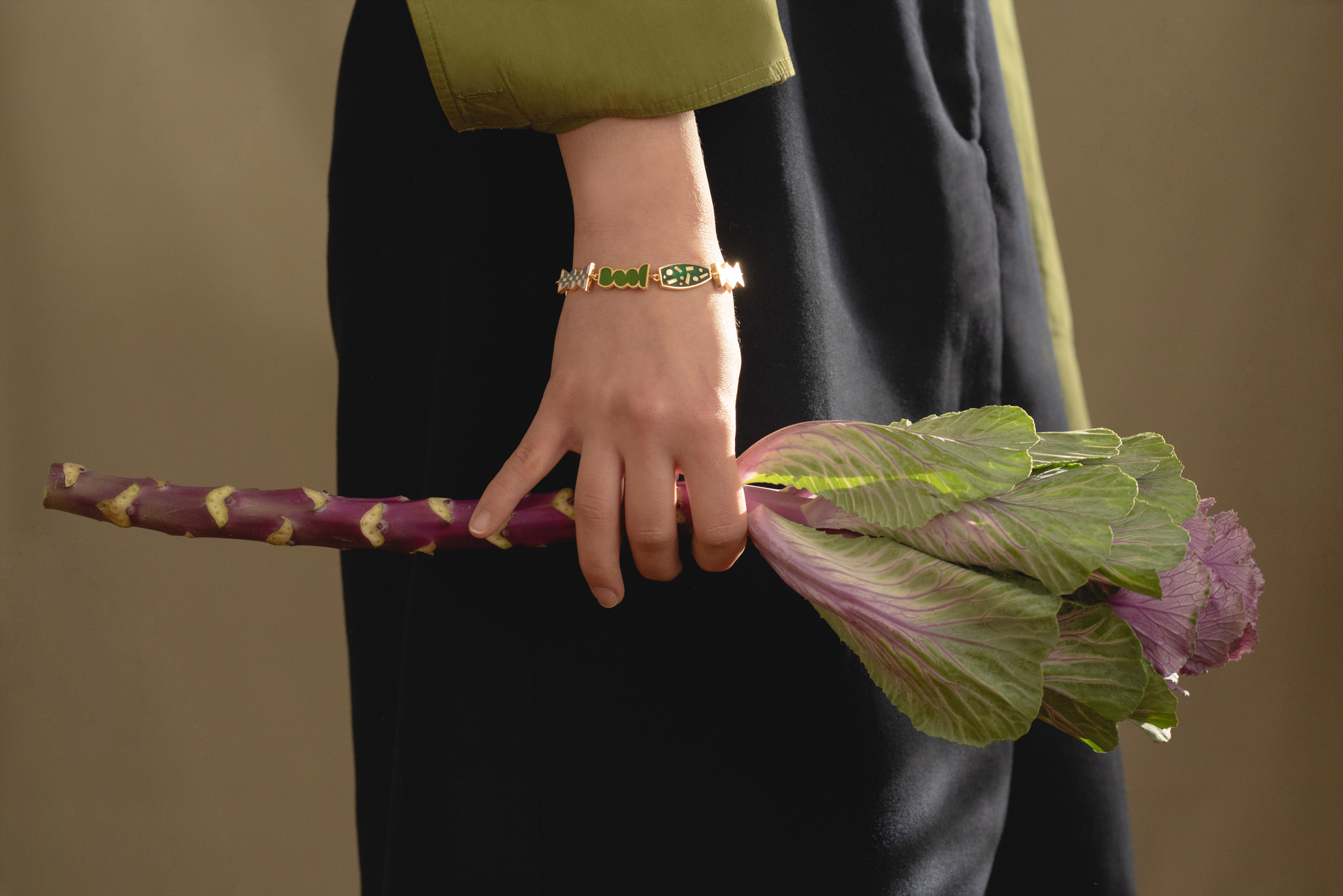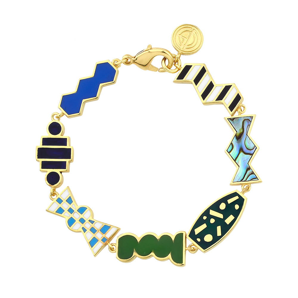 18 ct gold-plated brass bracelet featuring multi-color enamel and Australian mother-of-pearl handcrafted inlay.