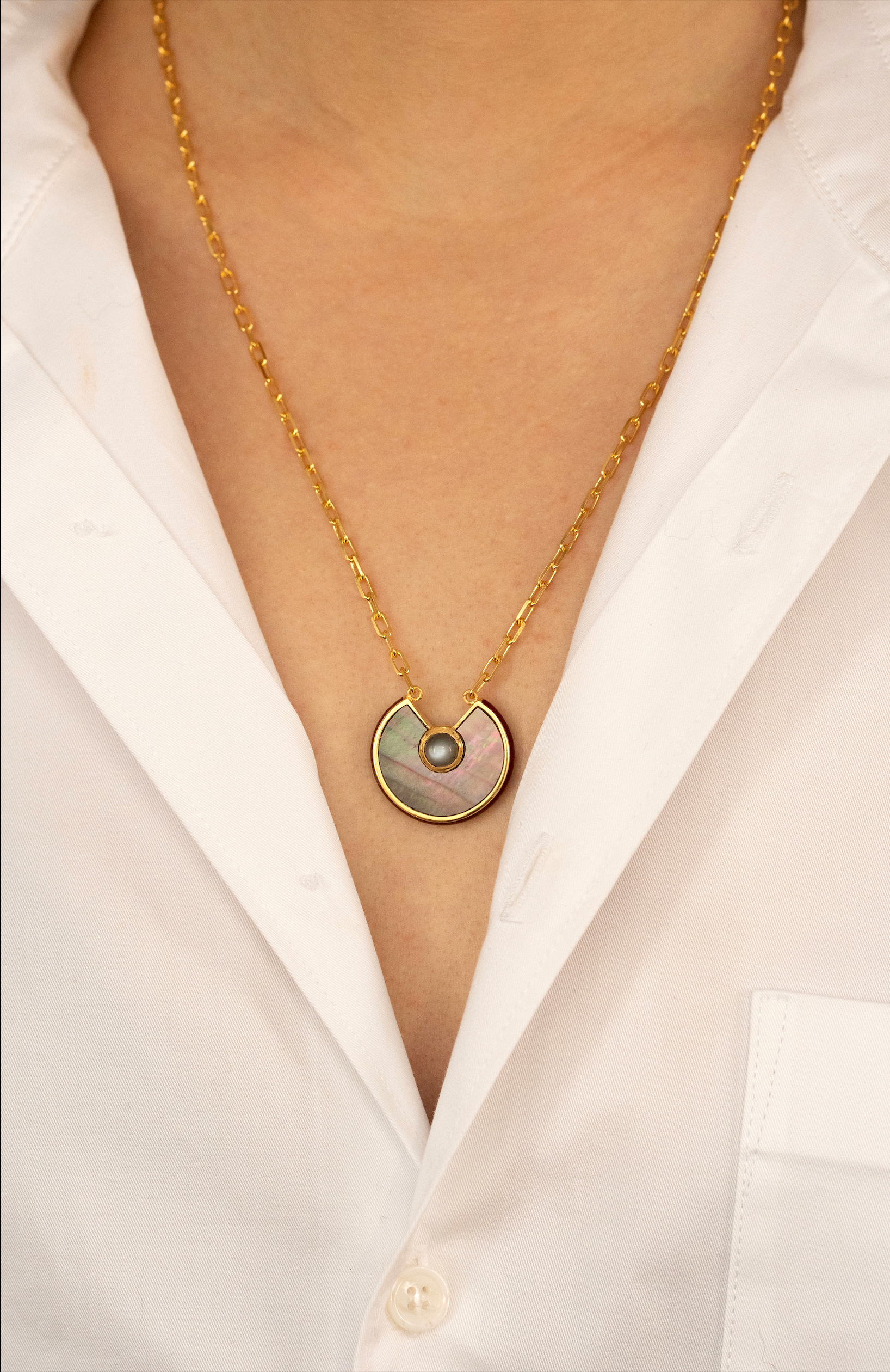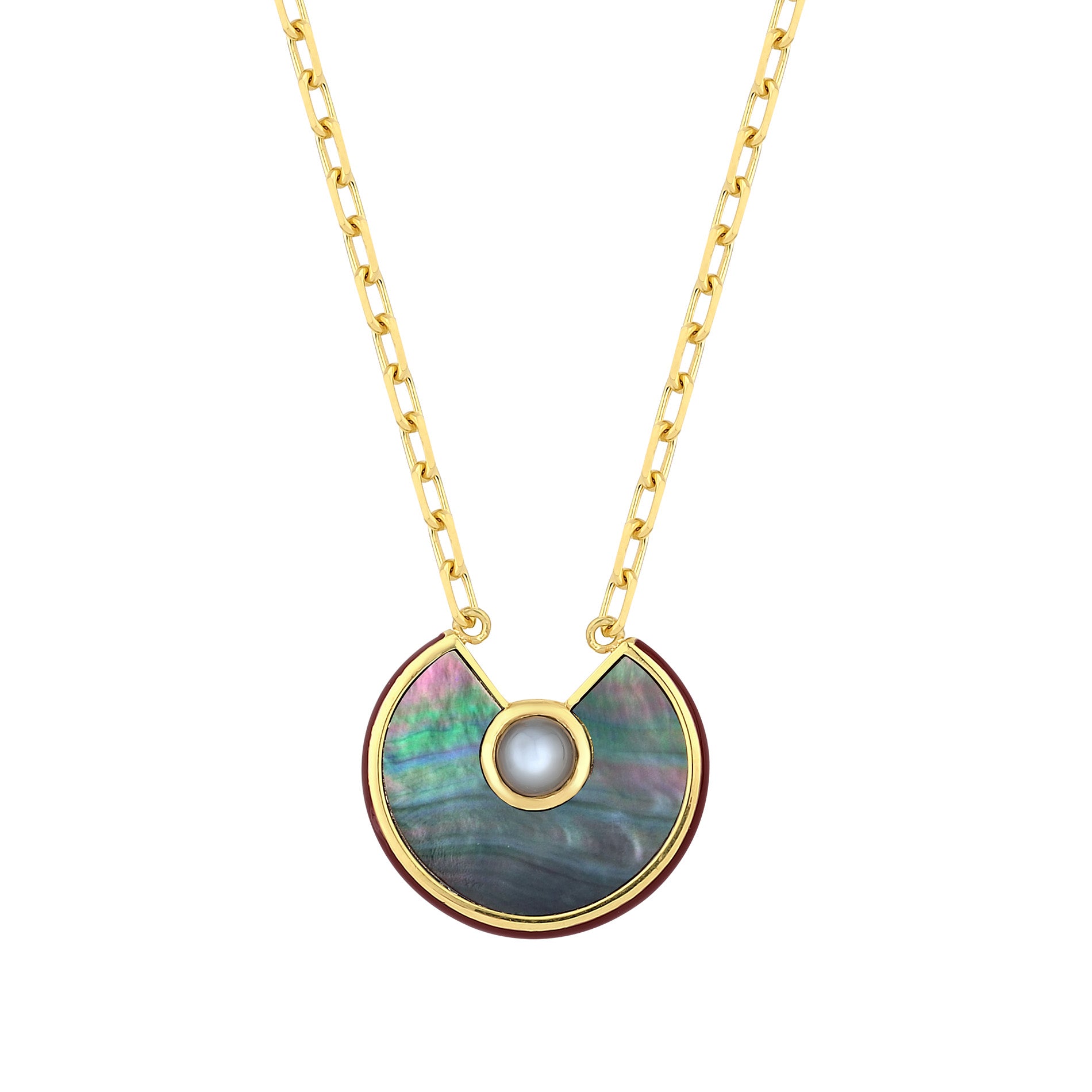 18 ct gold-plated sterling silver necklace featuring bordeaux, black & ivory enamel and embellished with Moonstone.