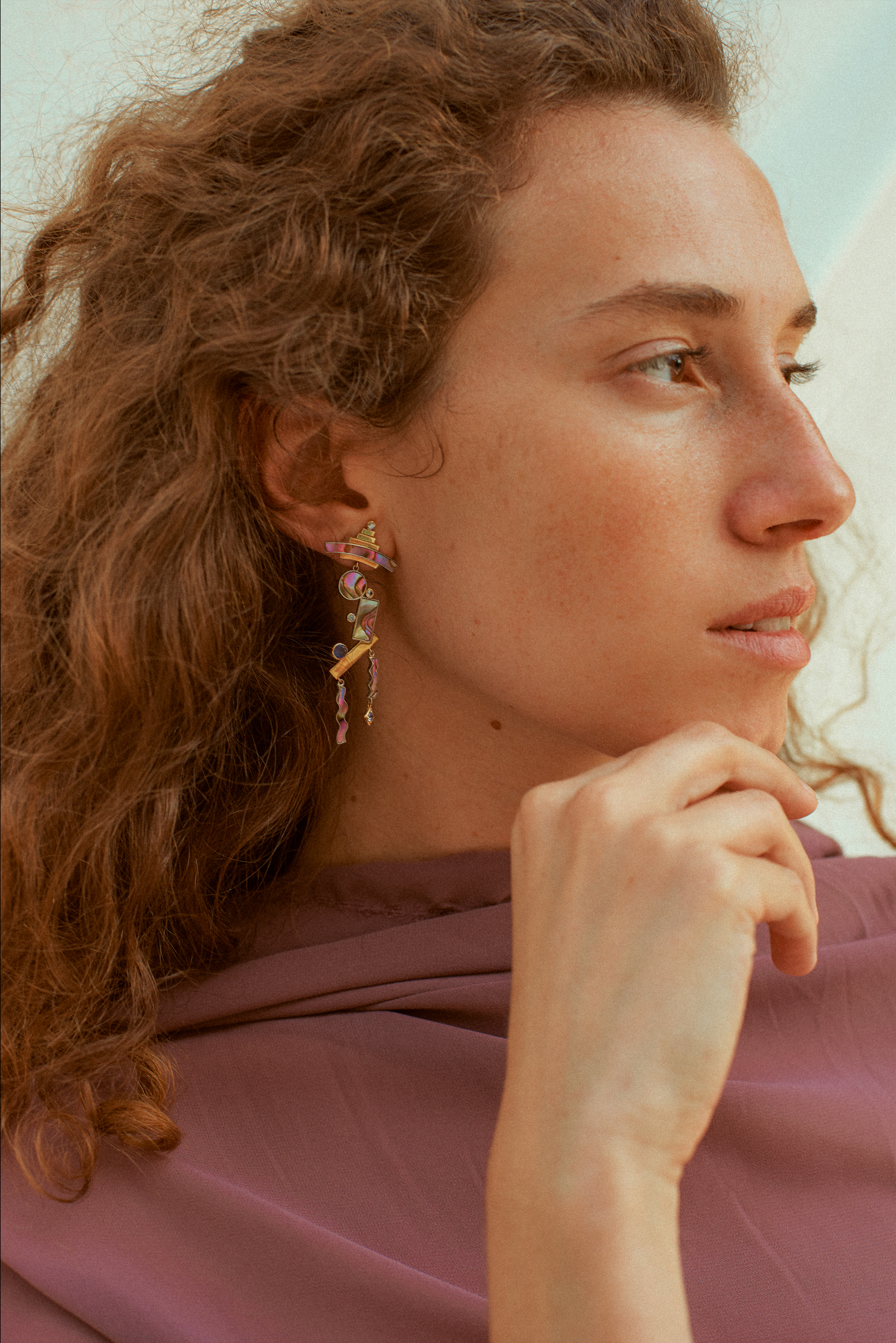 14 ct solid gold & 925 sterling silver earrings featuring Australian mother-of-pearl inlay and 0.75 ct Lavender Sapphires.