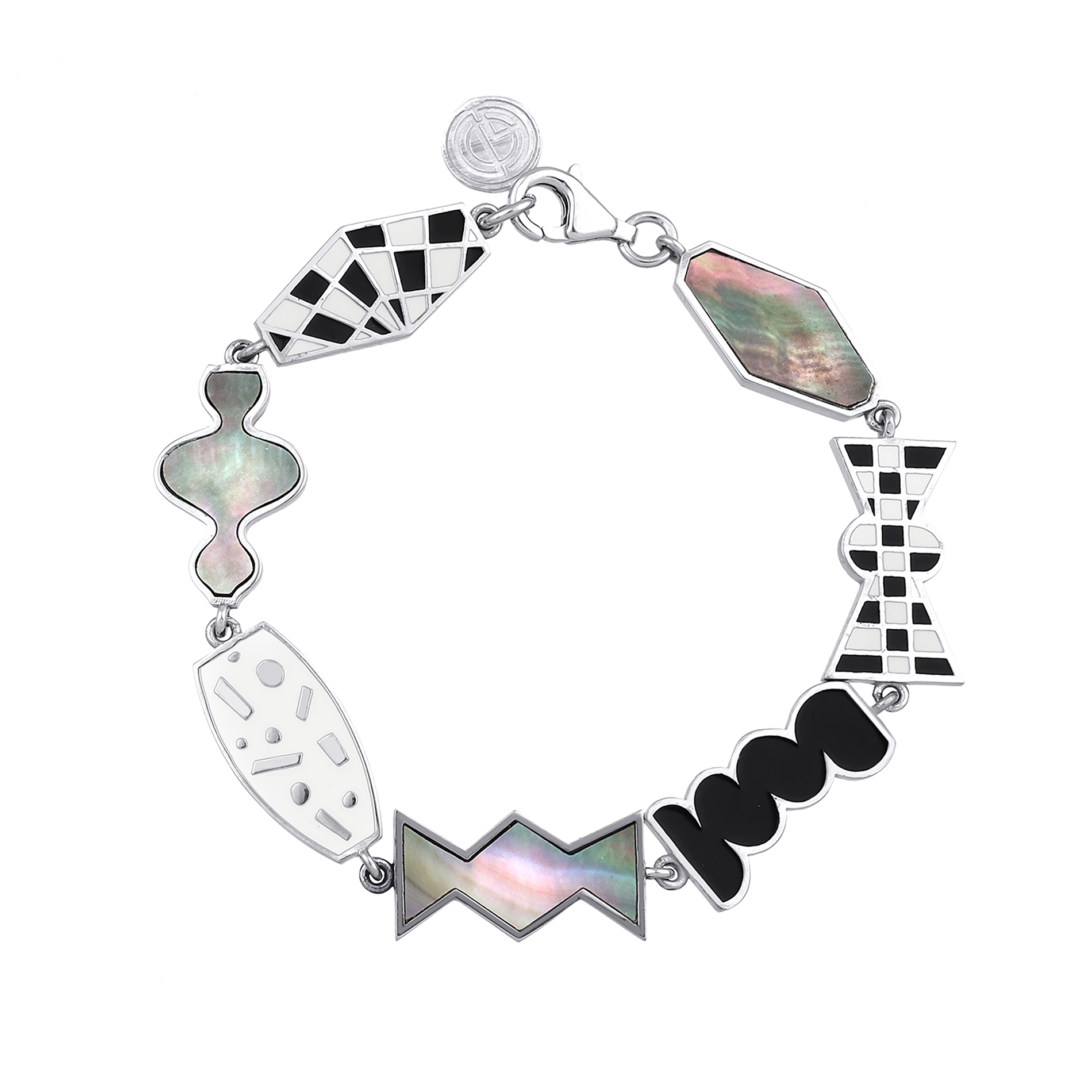 White gold-plated sterling silver bracelet featuring mother-of-pearl handcrafted inlay and black & ivory enamel.