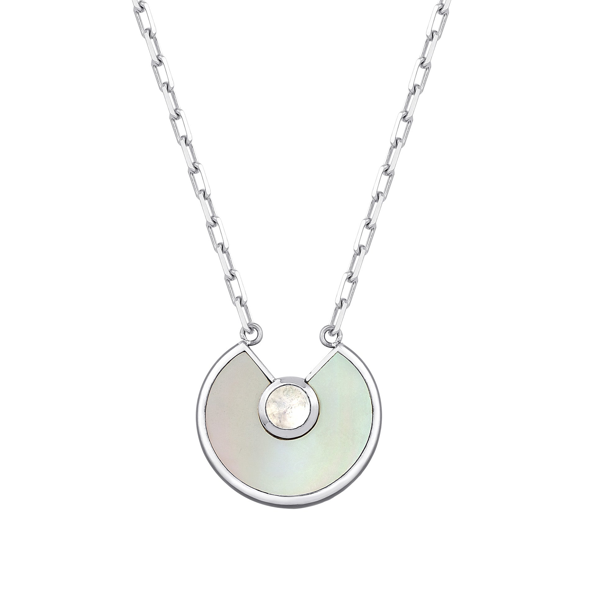 White gold-plated sterling silver necklace featuring grey & ivory enamel and embellished with Moonstone.