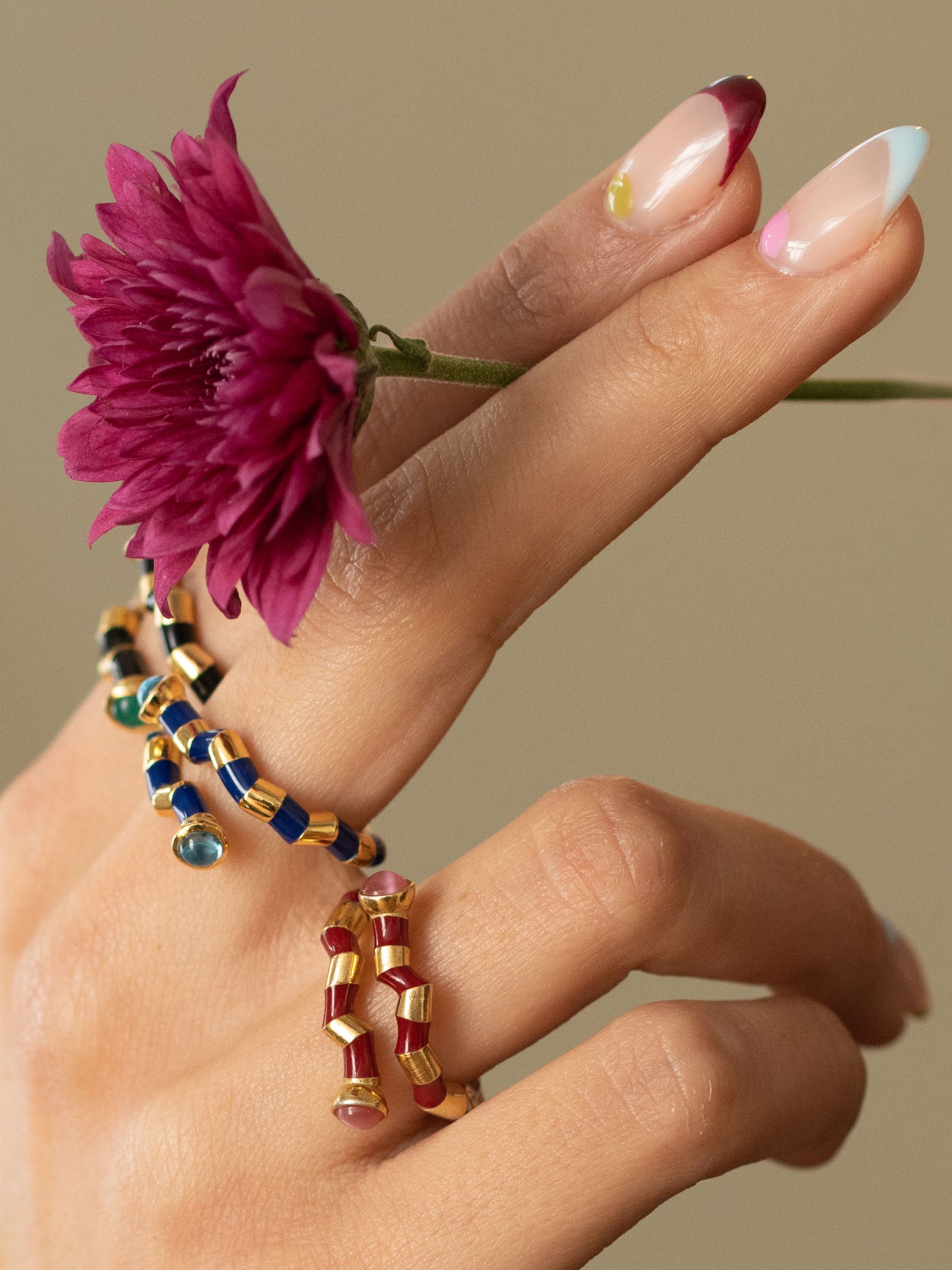 18 ct gold-plated sterling silver ring featuring enamel and embellished with (red) Rhodolite (blue) Topaz (green) Green Onyx (white) Moon stones.