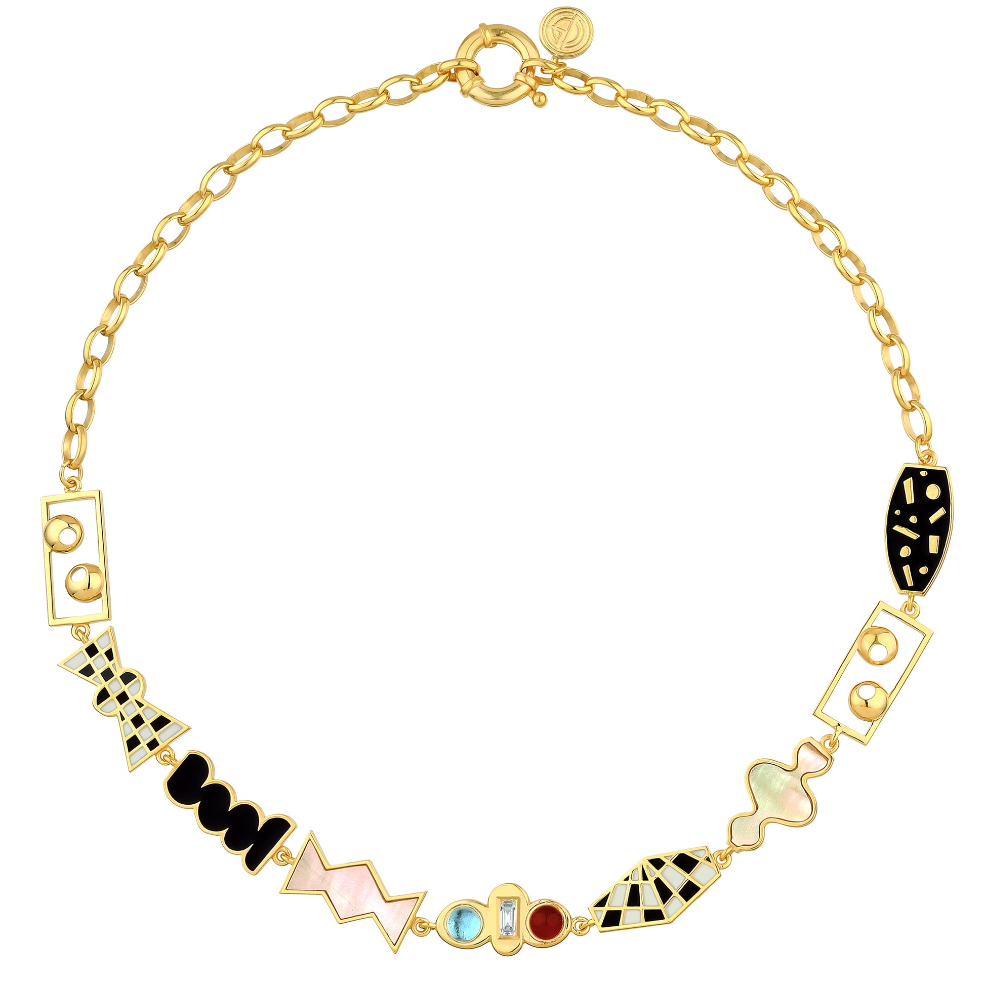 18 ct gold plated 925 sterling silver necklace featuring enamel, Australian mother-of-pearl inlay and embellished with Swiss Blue Topaz, White Crystal and Carnelian stones.